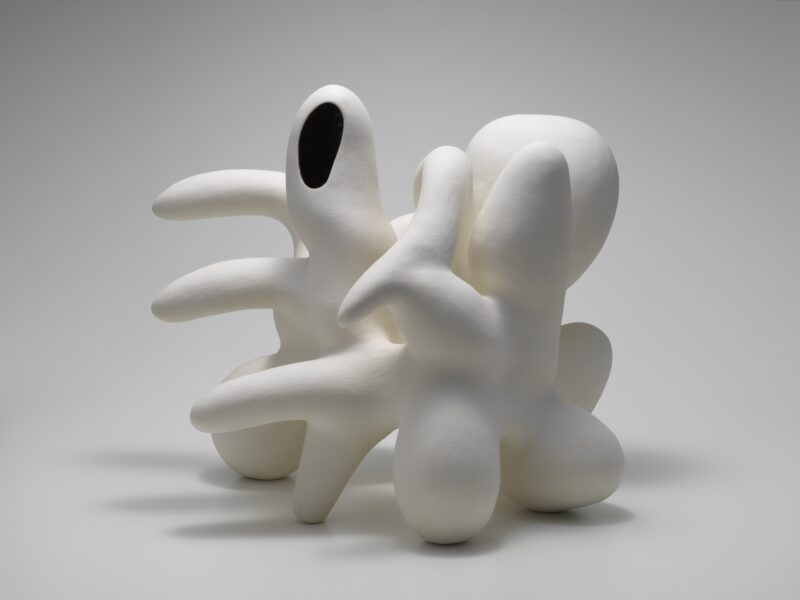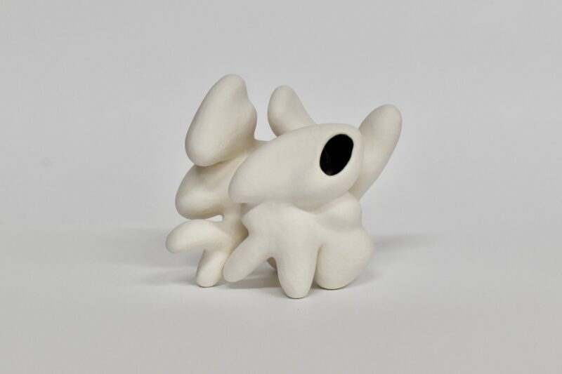 千葉は、線のドローイングをもとに造形し、陶表現を試みます。線を描くことで形を浮かび上がらせようとする行為は、土で造形をする過程において起こる身体的な動きに連動し、二次元から三次元へと立ちあがろうとする造形の糸口となります。